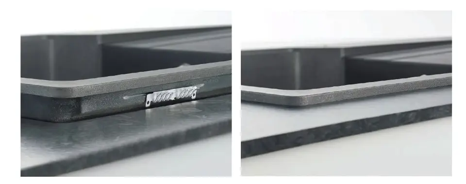 Tectonite® is een synthetisch, hightech-, licht- en sterk materiaal. Door de toevoeging van glasdeeltjes in de nieuwe coating, is Tectonite® zeer krasbestendig. De unieke textuur van de Tectonite® spoelbakken zorgt ervoor dat water parelt op het oppervlak en daardoor makkelijk af te nemen is. De structuur wordt in de mal aan het materiaal toegevoegd, waardoor het materiaal zijn unieke Tectonite® uitstraling krijgt. U kunt kiezen uit kleuren zoals zwart, grijs, vulkaan, koffie, crème en wit.