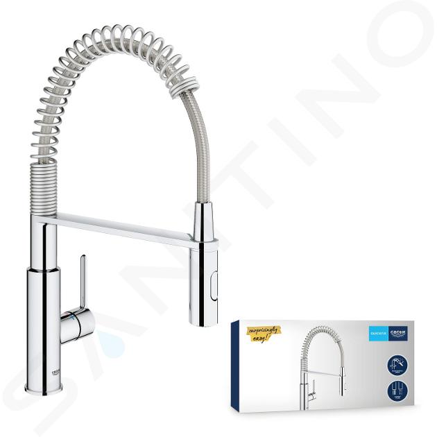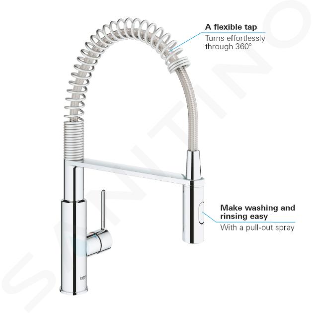 GROHE Get is een eengreeps keukenkraan uitgerust met een handige sproeikop, die maximale bewegingsvrijheid biedt voor al je activiteiten in de keuken. Met een standaard keukenkraan bereik je slechts een deel van de gootsteen, maar met de GROHE Get kan je dankzij de flexibele uitloop overal. Dit zorgt voor totaal comfort en gemak. Bovenop, de kraan beschikt over een straalschakelaar voor het schakelen tussen standaard en krachtige straal. Hierdoor kan je de waterstroom eenvoudig volgens je behoeften regelen.
