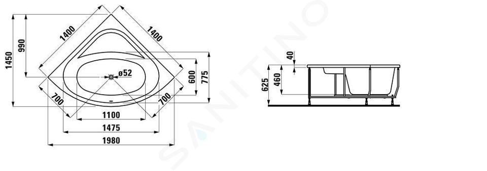 Hoekbad met aluminium constructie, inbouwversie lengte: 1400 mm diepte... Volledige omschrijving weergeven.